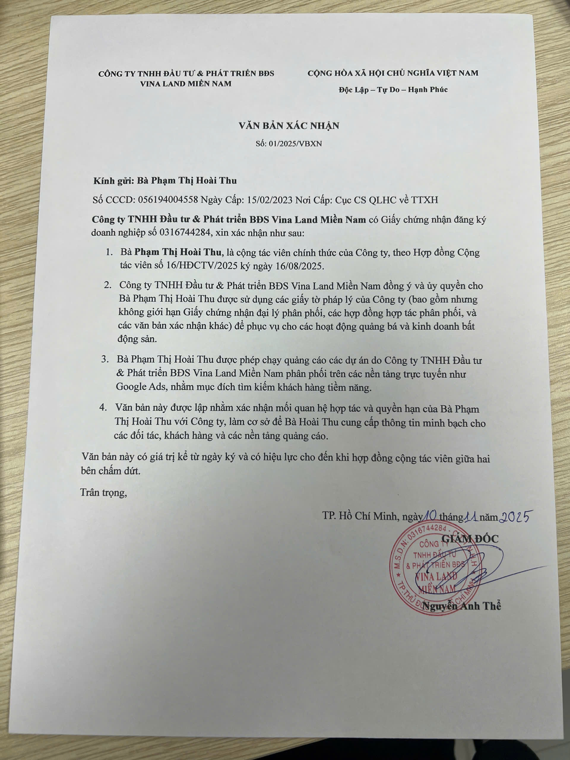 Hoạt động của tôi được thực hiện trên cơ sở hợp đồng Cộng tác viên hợp pháp, tuân thủ đúng quy định của pháp luật Việt Nam về kinh doanh dịch vụ môi giới bất động sản.